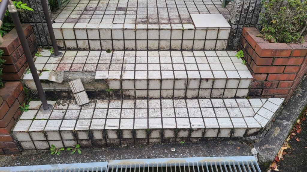 地調査の結果、階段の通路側の側面タイル5枚が剥がれ落ちている状態でした。