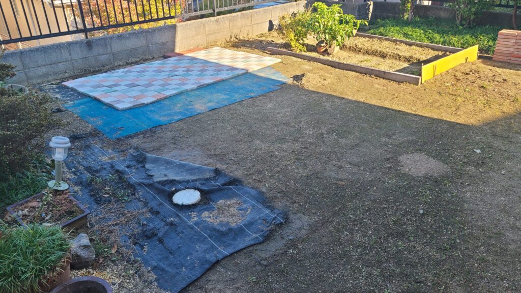 まずは土の鋤取り(土を撤去)をして、ある程度平らになるようにします。その後機械で転圧をして平らにする作業が終わり次第防草シートを敷いた後、タイルの接着になるように土を再度入れてタイルを敷きました。