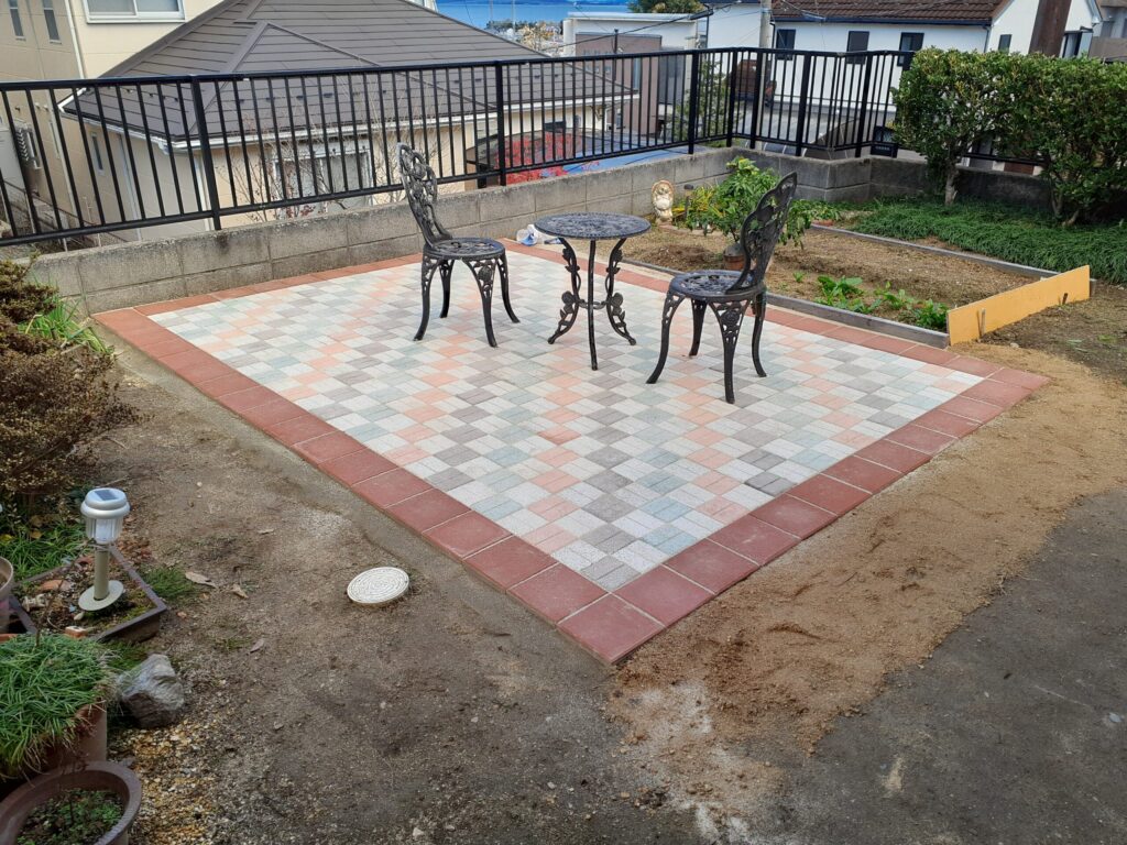 「機械での転圧や防草シートなど、下地から徹底して作り込むことで、お客様支給のタイルを年月が経っても沈みやズレが出ない、確かな安定感のある仕上がりに整えました。大津市のタイル敷きの施工事例をご紹介します。