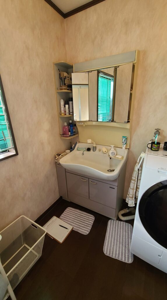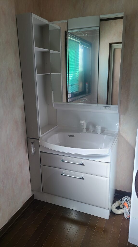 洗面化粧台は古く開き扉の収納でしたので、引き出し式のタイプに交換しました。