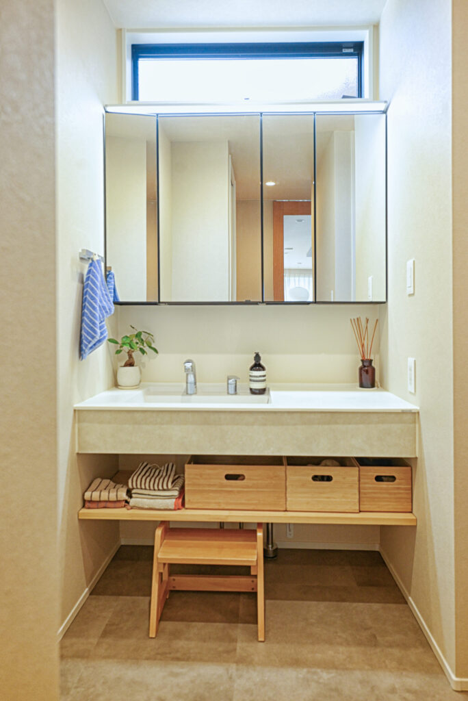 洗面ボウルはTOTOのエスクアを採用しました。オーダーメイドのような「造作風」のデザインに、四面鏡で贅沢な仕上がりになりました。