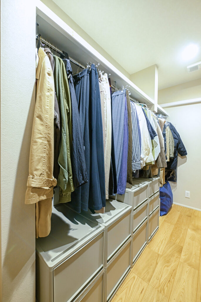 四帖あるWICには、休日に着る服をメインに収納でき、シーズンオフの使わない布団や扇風機等を収納できる十分な広さに。