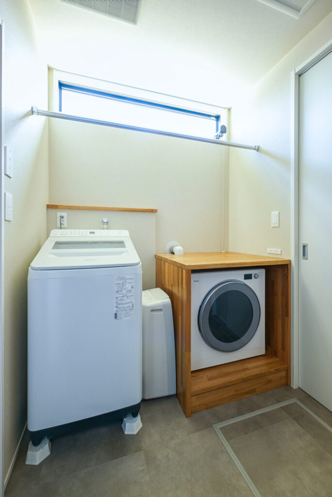 人気のガス衣類乾燥機「乾太くん」を、専用の木製造作棚にスッキリと設置しました。