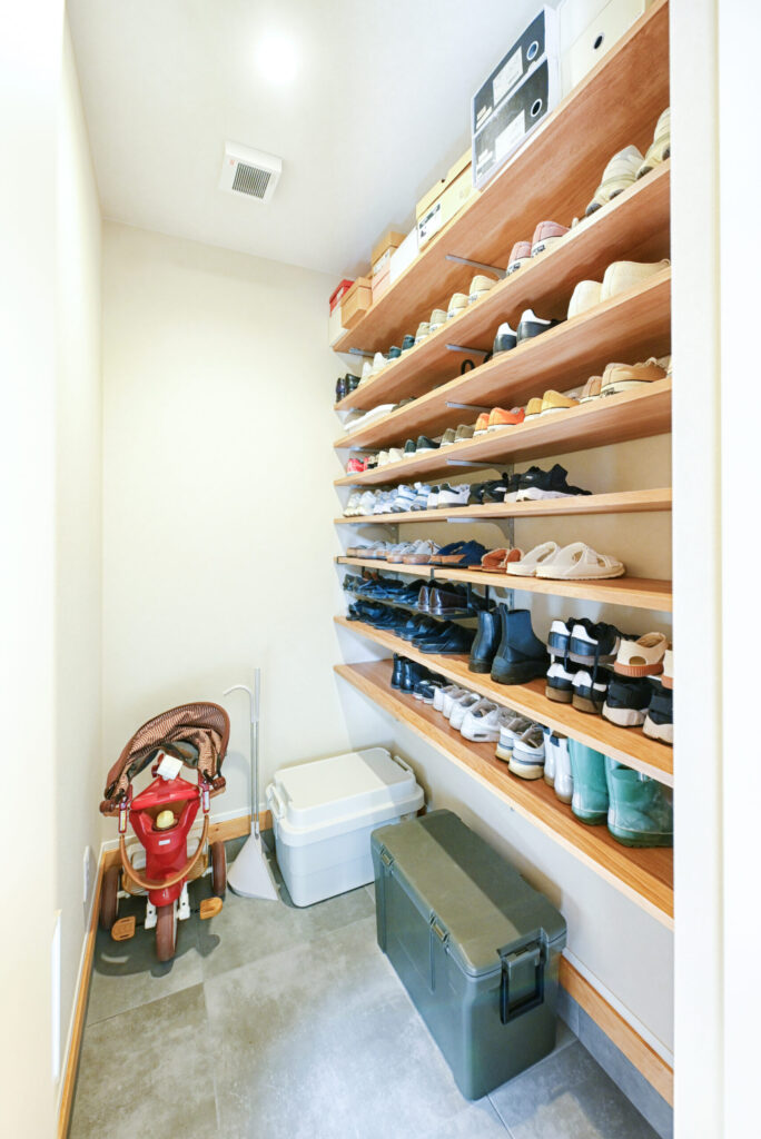 玄関横には、ベビーカーや外遊び道具もそのまま収納できる広々としたシューズクロークを配置。