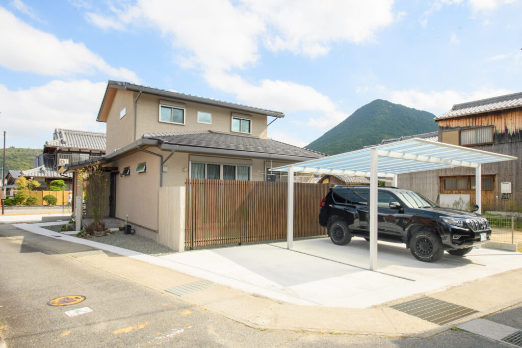 落ち着いた和風の街並みに調和するよう、外観デザインをこだわりました。 屋根には重厚感のある瓦を採用し、さらに、大きく下屋を設けることで、建物全体にどっしりとした安定感と、和の住まいならではを生み出しています。木目の格子やルーバーフェンスをアクセントに加えることで、モダンなデザインに仕上げました。